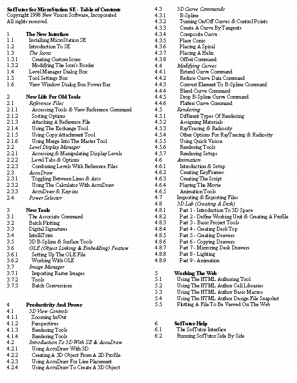 1994 - 2012 Copyright New Vision Software, Incorporated. All Rights Reserved. SofTutor is a registered trademark of New Vision Software, Incorporated. "the end of the learning curve", "Teacher Inside of ...", Teacher Inside ...", "Teacher Inside of AutoCAD", "Teacher Inside of MicroStation", "Teacher Inside of MS Office", "Teacher inside of Photoshop" are trademarks of New Vision Software, Incorporated. All other trademarks are the property of their respective holders.